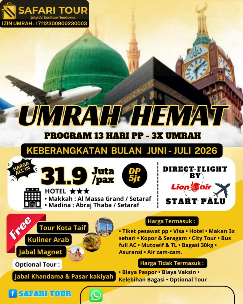 Dapatkan paket umrah dibulan Juni-Juli 2026 bersama Safari Tour dengan program perjalanan selama 13 hari dan mendapatkan free perjalanan destinasi di kota Makkah.