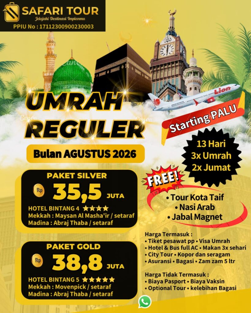 Safari Tour menyediakan paket umrah plus Mesir pada bulan Oktober 2025 dengan program perjalanan selama 16 hari berangkat dari kota Palu.